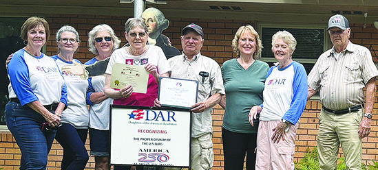 The Daughters of the American Revolution (DAR) John Everett Chapter of Columbus and the Sons of the American Revolution (SAR) Robert Rankin Chapter of Houston recently recognized Robert and San- dy Chaloupka for proper display of the US Flag. The flag is proudly displayed in front of their residence at 210 Oak Cluster in Columbus. Robert Chaloupka has special feelings for the US Flag. His father was wounded on D-Day 1944. He had several family members serv ing during WWII. All family members made it home safely after the war. On hand for the presentation are, from left, Susan Glover, Donna Pustejovsky, Connie Dittrich, Sandy and Robert Chaloupka, Stephanie Mattix, and, Judy and David Zachmeyer. Making an appearance in the back was George Washington. Photo by Chanea Grisham