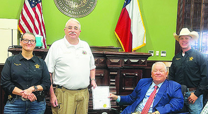 The Colorado County Commissioner’s Court issued a proclamation stating September 2025 as National Emergency Preparedness Month on Sept. 22 at the regular session of commissioners court. Coounty Judge Ty Prause, seated, made a special announcement by recognizing Charles “Chuck” Rogers, emergency management coordinator for Colorado County, for all he has done for the county in helping it prepare for emergencies since he began his position. Receiving the proclamation is, from left, Colorado County Sheriff Captain Wendy Alley, Rogers, Prause and Colorado County Sheriff Justin Lindemann. Photo by John Jones, Banner Press