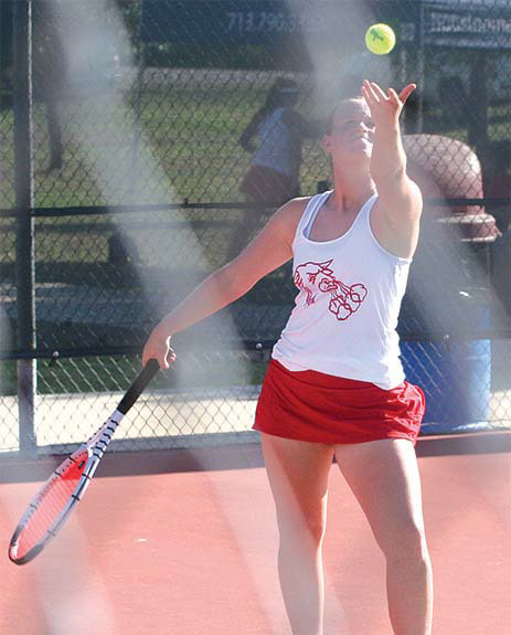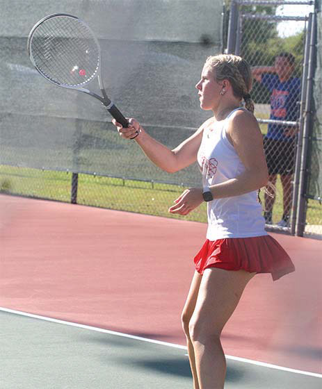 Bellville tennis player Caroline Poffenburger serves up a ball during a meet vs Wharton High School Sept. 22 at Bellville High School. Banner Press photos by Brian PiersonBellville tennis player Lillian Kmiec hits a ball across the net during a meet vs Wharton High School Sept. 22.