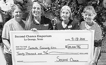 Second Chance Emporium recently donated $20,000 to the Smithville Community Clinic. On hand for the presentation were, from left, SCE Assistant Store Director Marlene Schnell, Smithville Community Clinic Executive Director Kristi Far - quar, SCE Store Director Gayle Schielack, and SCE Assistant Store Director Darlene Strahan. Second Chance Empori - um also donated $20,000 to the TCHCC, $11,000 to the Fayette County EMS Foundation and $2,000 to the La Grange Juneteenth Committee. Courtesy photo