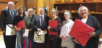 Mason Lodge Caledonia 68 of Columbus recently donated to the Share Your Christmas Ministry at the First United Meth - odist Church. On hand for the donations were, from left, Ma - son Lodge Caledonia 68 Treasurer Tom Fleming, Share Your Christmas Lutheran Chairperson Heather Thomas, Share Your Christmas First Baptist Church WMU: Chairperson Nancy Hooper, Mason Master Dale Alexander, Share Your Christmas Methodist Co-chairs Kathy Pustejovsky and Cher - yl Mannings and FULMC Pastor Sunshine Reyes. Donations are being accepted at FUMC, 1229 Milam Street, Columbus, TX 78934. Write SYC in the memo line. Photo by Ramona Ferguson, Banner Press