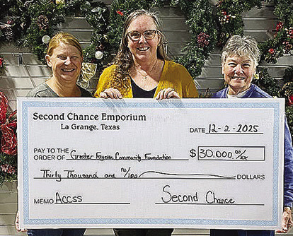 Greater Fayette Community Foundation receives generous donation from Second Chance EmporiumLA GRANGE — Second Chance Emporium (SCE) recently donated $30,000 to the Greater Fayette Community Foundation, designated for the Alliance for College and Career Student Success (ACCSS) program at Blinn College. Monies donated will be used for the ACCSS dual credit scholarship program and/or workforce coursework scholarships for Fayette County students in need at partner campuses. Grant monies will also be used to support ACCSS special projects and recruitment events. ACCSS is a partnership between rural public school districts and Blinn College District, working together to share resources and to provide more dual credit opportunities and career pathways for students in their region. These partners will work collaboratively to provide academic and career resources, guidance and support necessary for students to complete a post-secondary or workforce career credential. On hand for the presentation include, from left, SCE Assistant Store Director Marlene Schnell, ACCSS Director Susie Shank and SCE Assistant Store Director Darlene Strahan. Courtesy photo