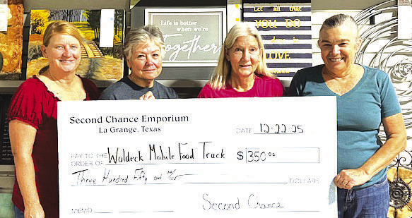 Second Chance Emporium (SCE) recently donated $350 to the Waldeck Mobile Food Truck. Monies donated were used to purchase safety vests for the volunteers at the work site. The Waldeck Mobile Food Truck provides assistance to those with food insecurity through the Central Texas Food Truck Mobile Pantry. On hand for the presentation were, from left, SCE Assistant Store Director Marlene Schnell, SCE Assistant Store Director Darlene Strahan, SCE Store Director Gayle Schielack and Waldeck Mobile Food Truck Coordinator Doris Wittkamm.