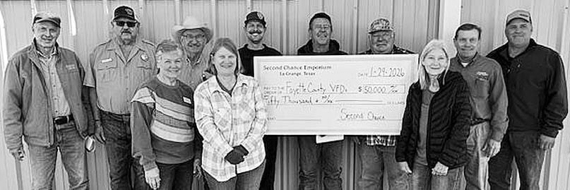 Second Chance Emporium (SCE) recently donated a total of $50,000 to the 10 volunteer fire departments of Fayette County (La Grange, Schulenburg, Fayetteville, Flatonia, Round Top/ Warrenton, Ellinger, Muldoon, Ledbetter, Winchester and Carmine each received $5,000) in appreciation of their service to the Fayette County. On hand for the presentation were, front row, from left, SCE Assistant Store Director Darlene Strahan, SCE Assistant Store Director Marlene Schnell, and, SCE Store Director Gayle Schielack; and, back row, Daryl Ray, Car - mine VFD; Greg Hunger, Ellinger VFD; Randy Noviskie, Fayetteville VFD; Chris Swenning, Flatonia Fire and Rescue; Frank Menefee, La Grange VFD; Rodney Read, Ledbetter VFD; Calvin Krause, Round Top/Warrenton VFD and Darren Guentert, Schulenburg VFD. Not pictured were representatives of Muldoon VFD and Winchester Area VFD.