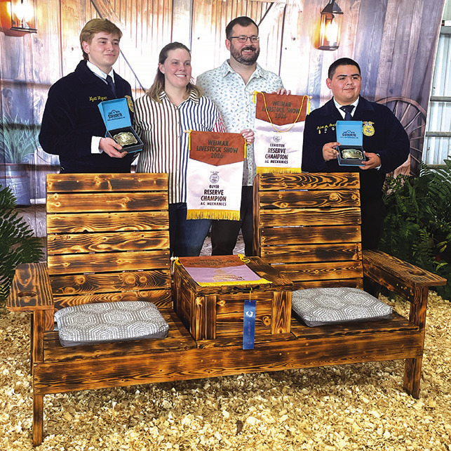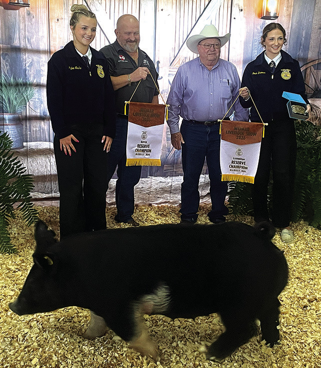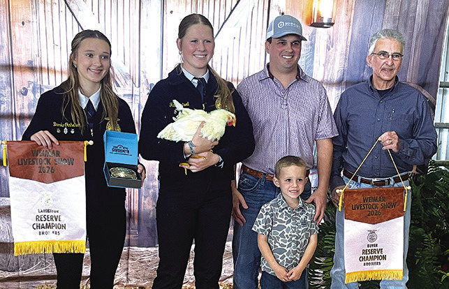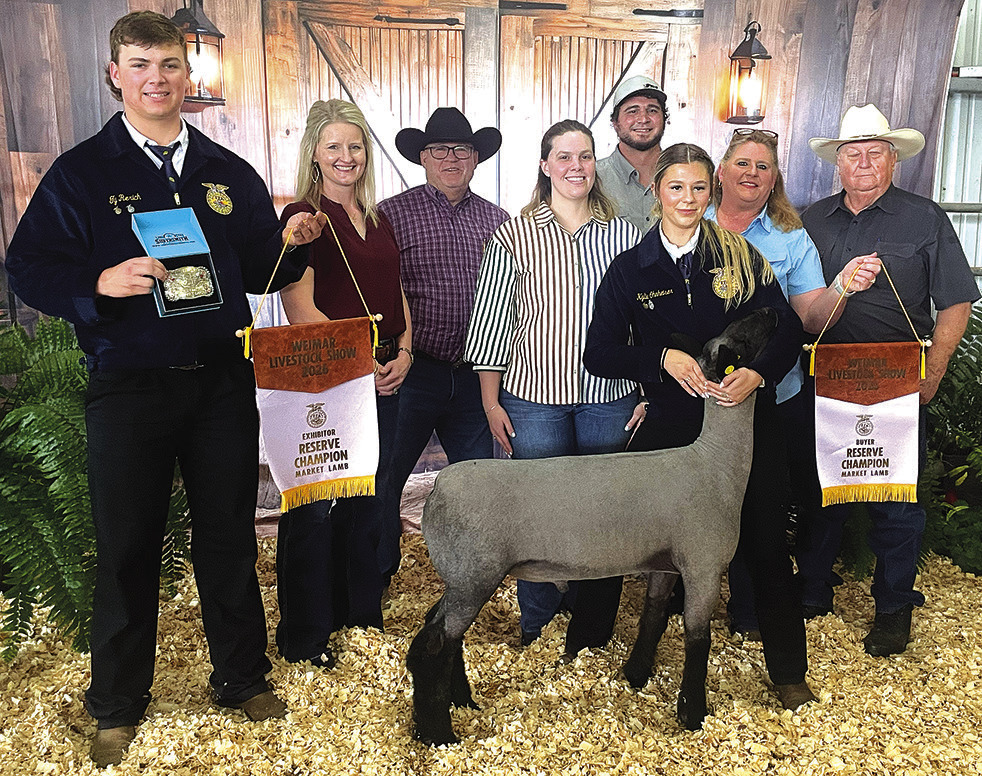 Kylie Ohnheiser exhibited the reserve champion market lamb that was purchased for $4,500 by A Team (Seybro Door & Weatherstripping, Johnny and Sharon Dobecka, KC Insurance — Larry “Bear” Kana, Weimar Vets Baseball, Mr. B Fireworks, Willie Joe’s Processing, Colorado County Precinct 1 Commission Ryan Brandt, Dwayne and Ronna Fishbeck, Team Bubela Real Estate, RLJ Cattle — Constable Lonnie and Renee Hinze Family, Art and Rita Janecka, Kevin Schimcek Construction, Koopman Caterling, Boe Reeves Family, CompuCleanser, Weimar Meat Company, M&M Welding, Tegeler Chevrolet, Wick’s Western Auto, Weimar Home Furnishers, Oak Grove Vet Clinic, The Pharmacy Shop of Weimar, Fayette Savings Bank, Dittrich Cattle Company, Weimar Knights of Columbus, Bill and Liz Treptow, West County Farms, Colorado County Sheriff Justin Lindemann, Colorado County Tax Assessor Collector Melinda Zajicek, Mark and Valerie Harmon, Schulenburg Printing, and Stephen Helmcamp Family).