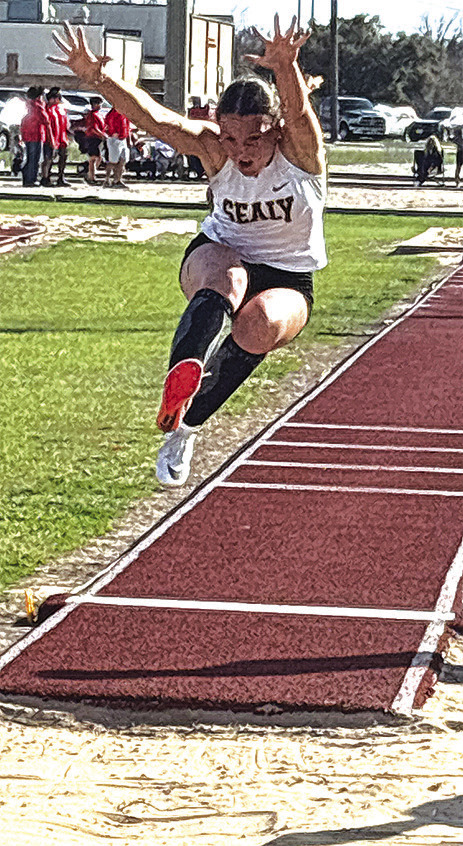 Sealy long jumper Zoe Allen makes her jump into the sand March 5 during the Archie Seals Relays at Brahmas Stadium in Bellville. Banner Press photo by Brian Pierson