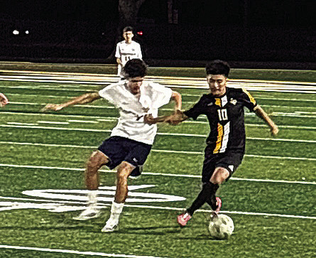 Sealy senior forward Miguel Rodriguez, 10, holds off a Katy Freeman defender while making a move on the ball. Banner Press photo by Brian Pierson
