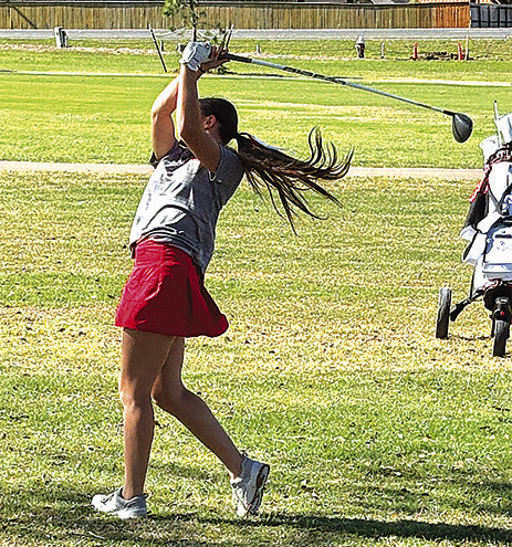 Brahmanettes golfer Jenna Belcher hits an approach shot on the first hole of Bellville Golf Course during the Bellville Golf