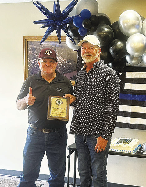 Columbus Police Chief Milton “Skip” Edman, right, receives his retirement plaque from Columbus City Manager Donald Warschak during Edman's recent retirement party at the Columbus City Hall Council Chambers. Edman has been the police chief of Columbus for nine years. Photo by John Jones, Banner Press