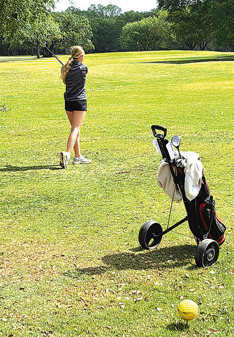 Flatonia golfer Tatum Bickley hits a tee shot on the ninth hole.