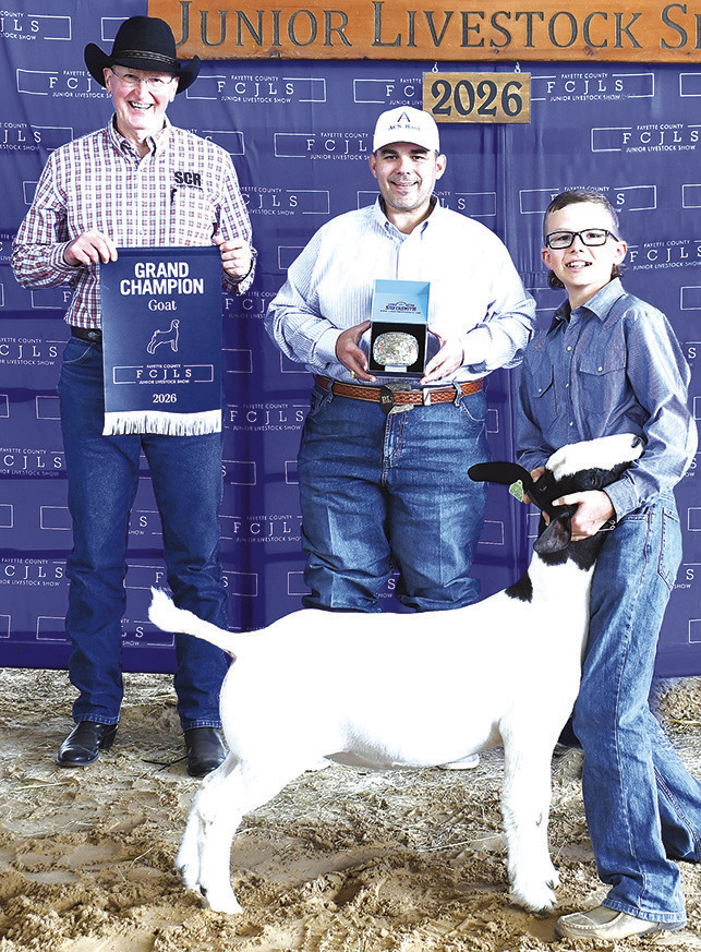 Tate Fritsch, Fayetteville 4-H, exhibited the grand champion goat that was purchased for $33,050. Grand champion buckle sponsor was Rocky Hill Farms. Initial buyers were Paul Sorensen, Sandy Creek Ranch; and Austin County State Bankl Buyers on hand for the recognition was Paul Sorensen, left, and Brandon Luedke, Austin County State Bank. Add on buyers were Fritsch Cattle Co, B&B Cattle, High Hill Supplements, Jarrod Poncik, Welch Vet Clinic, Joe Rogers Dozer, Tegler Chevrolet, Daniel and Rachel Schley, Texas Farm Credit, Vitek Construction, Aspen Midstream, Appel Ford – Buck Williams, La Grange Farm and Ranch, MidTex Materials, Carmine State Bank, Jerry Rhodes, Triple E Transport, TriCo Disposal, A&D Flatbed, Hallettsville Livestock, Oak Valley Vet Clinic, Powerscreen, Hansford Co Feeders, Canadian Feedyard, Carmine Feed and Fertilizer, Crooked Creek Farm, Round Top State Bank, Brad Neville, 1423 Investments, Capital Farm Credit, Smith Powerline, Josh Vanderver for County Judge, and Fayette Savings Bank.
