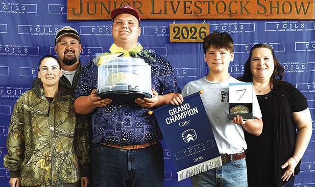 Jacob Nigh, Fayetteville FFA, exhibited the grand champion cake that was purchased for $3,000. Grand champion buckle sponsor was Inspired Treats and Events by Nae, Shannon Hemmitt. Buyers on hand for the recognition were, from left, Dorothy and Derek Schwenk; Jacob Nigh; Josh Nigh, holding banner and buckle; and Tiffany Nigh.