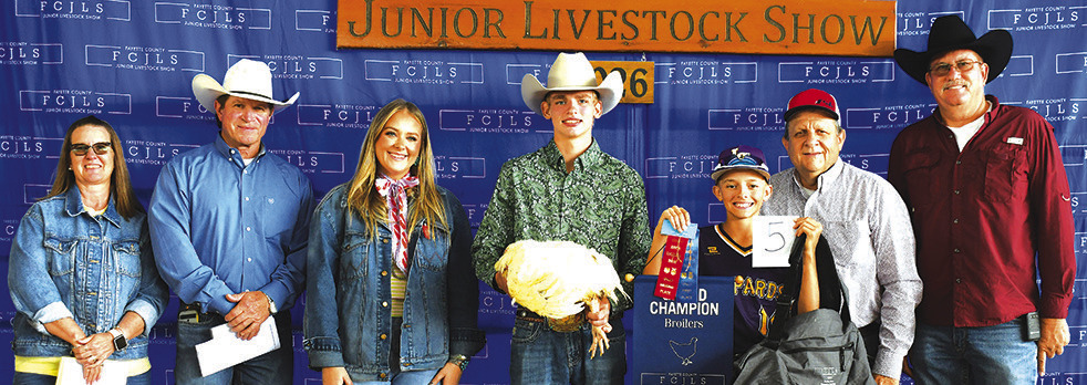 Quade Brothers, Fayette 4-H Shooting Sports, xhibited the grand champion broilers that were purchased for $16,525. Grand champion buckle sponsor was In Memory of Emily Fritsch. Buyers on hand for the recognition were, from left, Robyn Weyand, Russell Weyand Construction; Ron Beck, Flatonia Livestock; Morgan Dornak, La Grange Farm and Ranch; Brothers; Candyn Janca holding Banner, Rodney Kalich, Fayette Savings Bank; Rodney Kalich, and Joe Rogers. Buyers not pictured were MCA Petroleum, Lisa Matula, McCourt and Sons Equipment, Supak’s Inc., Kleiber Tractor & Equipment, Bumper Crop, Brandon & Brandi Wischnewsky, La Grange Automatic Gates, DeBord Technical Services, TXBRS, Kay Carlton, JB Horseshoeing, Fixpatrick’s Garage, Schovajsa, Mayer & Klesel, Clear Title Company, CTL Tree Services, TX Fence Company, Luck Welding, T-31 Farms, Mueller Feed, Oviedo Auto Group, MidTex Materials, Ohnheiser Cattle/Oma’s Choice, Colorado Valley Telephone, Giddings Livestock, Neal and Jessica Janacek, Lee and Phyllis Fritsch, Welch Veterinary Clinic, A&D Flatbed & Trailers, Smith Power Line Construction, Aspen Midstream, Chris Batten Agency – Renee Supak, Levi and Becky Garlick, Schnell Hauling, Bubba and Carrie Harbers, KenLin Foundation, 979 Trucking, Muldoon Minerals, Heath and Jennifer Golan, Wicks Well Service, Krystal Dahse – Reve Hair Salon, Jerry Rhodes, David Newcomb, Lonestar Cattleman, Diamond B Enterprises, Ted Harbers Plumping, Hodde and Hodde Land Surveying, Vitek Construction, Bruce and Tammy Mozisek, Butch and Jeanie Bertsch, and TriCo Disposal.