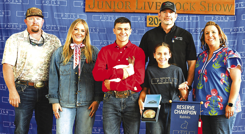 Conner Fricke, Round Top Carmine FFA, exhibited the reserve champion rabbits that werepurchased for $10,900. Reserve champion buckle sponsor was Neal and Jessica Janacek. Buyers on hand for the recognition were, from left, Casey Lange, Morgan Dornak, La Grange Farm and Ranch; Conner Fricke; holding buckle and banner Emery Fricke; buyers Buck Williams, Appel Ford; and Amy Dooley, Bluebonnet Abstract and Title. Buyers not pictured were Kyle and Monica Fricke, Thomas and Roxanne Fricke, MLD Holdings LLC, Oviedo Auto Group, Hahn’s Construction, Clear Title Company, JW’s Steakhouse, TriCo Disposal, W4 Roll-Offs, FLC Holdings LLC, Busted Oak Cellars, Lisa Mayer, Round Top Real Estate; Fayette Electric Coop, Fayette County Farm Bureau, Kleiber Tractor, Charles and Lilla Sivek, Schmidt Funeral Home, Colorado Valley Communications, Windmill Ranch, Bryn and Sara Behnke, Capital Farm Credit, Los Patrones Burton, Sandra Weikel, Wayne and Pearlie Wagner, Round Top Service Station, Old World Antieks, Bernshausen Fencing and Dozing, Botts Title Company, David and Gesine Koether, Burciaga Concrete Works, Travis and Tania Hardaway, Dennis and Sandy Crum, Janacek Farms, Jahnz Site Services, Texas Building and Roofing Supplies, Aspen Midstream, JoLynn Schoenberg, Oak Hill Ranch, Vitek Construc tion, Daniel and Rachel Schley, Joe Rogers Dozer and Fayette Savings Bank.