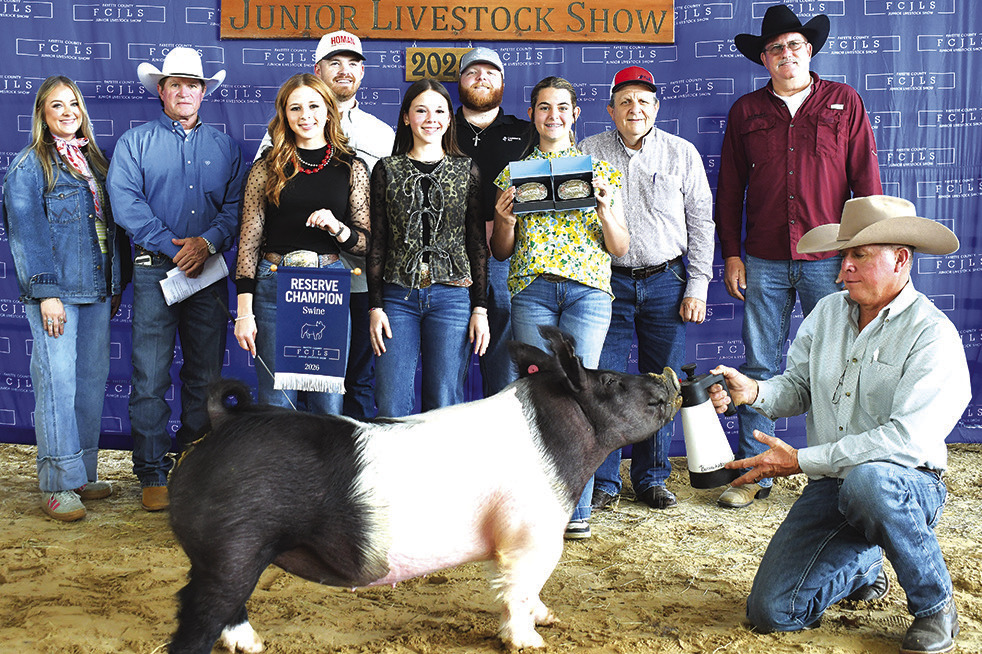 Cailee Daniel, Fayetteville 4-H, exhibited the reserve champion lamb and junior lamb showmanship that was purchased for $12,450. Reserve champion buckle sponsor was Texas Elite Fabrication. Junior showmanship buckle sponsor was Engle Farmers Mutual Insurance Co. Buyers on hand for the recognition were, from left, Shannon Hemmitt, H&K Cattle Co. (Payton Hemmitt not pictured); Morgan Dornak, La Grange Farm and Ranch; Brandi Daniel, Daniel Club Lambs; Ty Dallmeyer, Cadance Bank; holding banner Tatum Fritsch and holding buckles Kaisley Janecka. Buyers not pictured were Wayne and Donna Bell, West Creek Construction, Fedor Fence Co., Guaranty Title Co., Wayne’s Range, Texas Elite Fabrication, Aspen Midstream, Tyler and Kristina Mattijetz, Colorado Valley Communications, Harvey and Sarah Berckenhoff, Prosperity Bank, JK Ranch, Bart McBride, American Ag LLC, Land Brokers Real Estate, Appel Ford, Levi and Becky Garlick, Oviedo Auto Group, Vasut BBQ and Catering, La Grange Orthodontics, Randy and Cheryl Otto, Tiffany Nigh, Inspired Treats by Nae, Cilka Schielack, Triple E Transport, Welch Vet Clinic, Sandy Creek Ranch, Daniel and Rachel Schley, Vitek Construction, Giddings Livestock, B&B Cattle, MidTex Materials, and A&D Flatbed and Trailers.