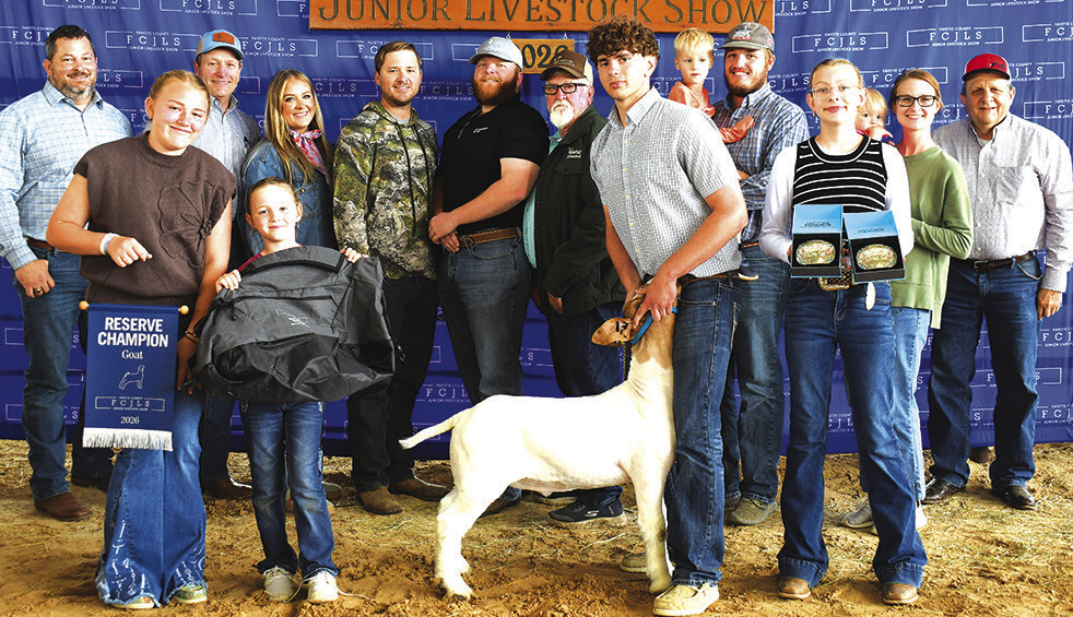 Kandon Kaspar, Fayetteville 4-H, exhibited the reserve champion goat and senior goat showmanship that was purchased for $14,675. Reserve champion buckle sponsor was Levi and Becky Garlick. Senior showmanship buckle sponsor was Engle Farmers Mutual Insurance. On hand for the recognition were, front row, from left, Henley and Emma Sodek, Orsak’s Café; Kandon Kaspar; and holding buckles Kennedy Kaspar; and back row, buyers Chris Kaspar, Round Top State Bank; Tim Knesek, Capital Farm Credit; Morgan Dornak, La Grange Farm and Ranch; Blake Krebs; Krebs Services; Ty Dallmeyer, Candance Bank; Glendale Krebs, Giddings Livestock (Lisa Krebs not pictured); Cade, Bradley, Claire and Jenna Folsom, EC Minssen Store; and Rodney Kalich, Fayette Savings Bank. Buyers not pictured were Fayetteville Show Fund, Lois and Leonard Kaspar, Hahn’s Construction, Chris and Bethany Kaspar, Fayette Electric Coop., Fayette County Vet, Tammie and Becca Royer, Roberts Associates, Emil and Mary Schley, Banks Pediatrics, Oviedo Auto Group, Ron’s Backhoe and Dozer, JK Ranch, Neal and Jessica Janacek, Texas Elite Fabrication, Land Brokers Real Estate, Tire Solutions, Gabe and Kelley Reza, Marcy and David Beard, Carmine State Bank, Lockhart Auction, Roan Ranch, Brent and Jessica Taylor, GJ&J Cattle, Casey Lange, Levi and Becky Garlick, Steven Bertsch, 14232 Investments, Jonathan and Carrie Harbers, HLG Land and Cattle, Tegeler Chevrolet, Joe Rogers Dozer, Fritsch Cattle Co., B&B Cattle, Vitek Construction, Jeannie and Butch Bertsch, Sandy Creek Ranch, Smith Power Line Construction, Aspen Midstream, Buck Williams, Appel Ford; MidTex Materials, and Daniel and Rachel Schley.