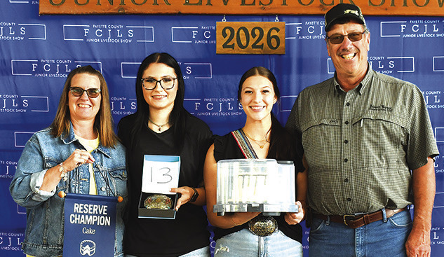 Nataley Polasek, La Grange 4-H, exhibited the reserve champion cake that was purchased for $900. Reserve championship buckle sponsor was Brandon, Jennifer and Carlie Jo Finke. On hand for the recognition were, from left, buyers Robyn Weyand; Colbey Schulze; Nataley Polasek; and buyer Russell Weyand, Weywand Construction LLC.