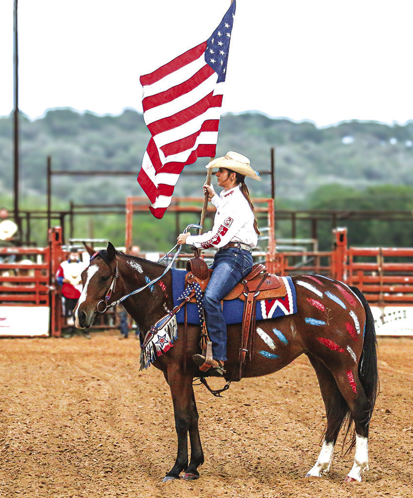 Flag bearer Teagan Kallus holds the standard during the FC Sheriff’s Posse Ram Rodeo on April 1718 near La Grange.